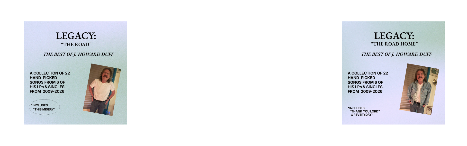 NICE JACKET RECORDS ANNOUNCES THE RELEASE OF TWO SIMELTANEOUS PROJECTS, WHICH ARE AVAILABLE ON ALL MAJOR STREAMING PLATFORMS, AND FOR PURCHASE ON CD.THE FIRST, “LEGACY: THE ROAD” FEATURES 22 HAND-PICKED SONGS FROM J. HOWARD’S STUDIO & LIVE RELEASES FROM 2005 TO PRESENT & FEATURES HIS HIT SINGLE “THIS MISERY”.THE SECOND, “LEGACY: THE ROAD HOME” IS ALSO A 22 TRACK “BEST OF” RELEASE WHICH FEATURES ALL GENRES OF SPIRITUALITY-BASED SONGS. THESE RUN THE GAMUT FROM GOSPEL TO ROCK & BLUES, AND MANY OF THEM ARE ORIGINAL COMPOSITIONS."THESE TWO PROJECTS WERE PUT TOGETHER AS A LABOR OF LOVE IN MY ATTEMP TO LEAVE A LEGACY TO MY FAMILY, FRIENDS, AND SUPPORTERS. THANK YOU ALL." – J. HOWARD DUFF 4/26